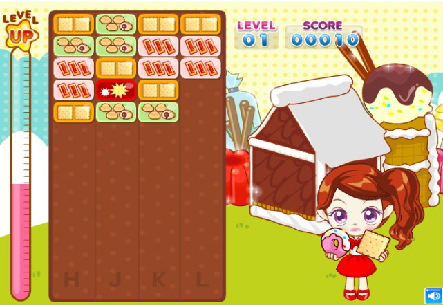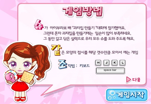 같은색.같은 모양의 과자 접시를 H.J.K.L 으로 선택하여 이동 하시면 됩니다.