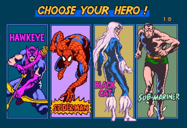 HAWKEYE.SPIDERMAN.BLACK CAT.SUB MARINER 중 한명을 선택하여 플레이 하게 되는데요