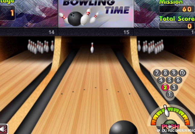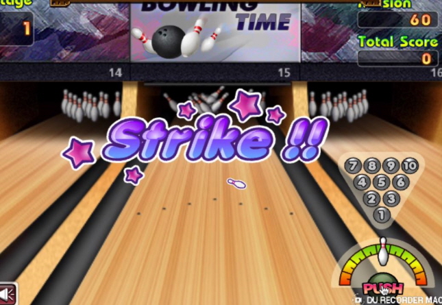 볼링공 위치에 따라 각도를 잘 조절하여 마우스로 PUSH 버튼을 클릭 하시면 되는데요